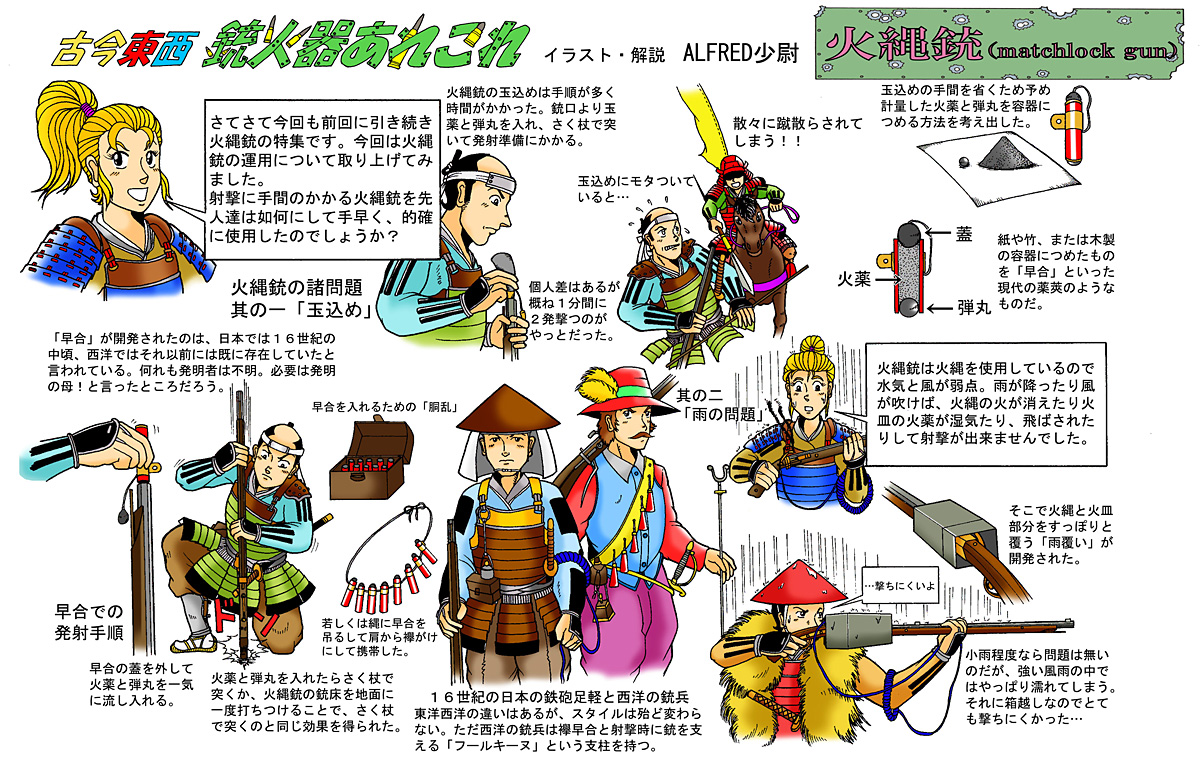 東洋西洋の違いはあるが、スタイルは殆ど変わらない。ただ西洋の銃兵は襷早合と射撃時に銃を支える「フールキーヌ」という支柱を持つ。