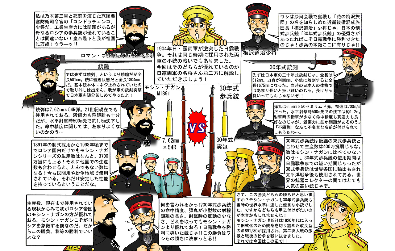 さて、この勝負どちらの勝ちだと思いますか?モシン・ナガンも30年式歩兵銃も当時の世界水準に達した優秀な小銃でした。ですからどちらも甲乙付けがたいのが本音かもしれませんね!モシン・ナガン M1891は1920年代に入って旧式化のため銃身を切り詰めた改良型のM1891/30が採用され、第二次大戦の激戦と戦後の紛争を戦い抜きました。それでは今回はこの辺で!!