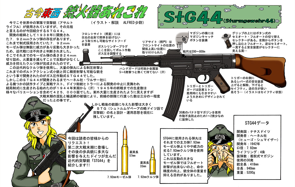 今でこそ世界中の軍隊で突撃銃(アサルトライフル)が使用されていますが、その元祖と言えるのが今回紹介するStG44。開発の経緯として1938年に開 発された7.92mmクルツ弾の存在があります。これまで制式採用されていた7.92mmモーゼル弾は無駄に威力があり反動も大きかったため、近代戦には 不向きと判断されました。そこでそれまでのモーゼル弾の長さを24mm切り詰め、火薬量を減らすことで反動が少なくし威力を抑えたクルツ弾が完成されたのです。