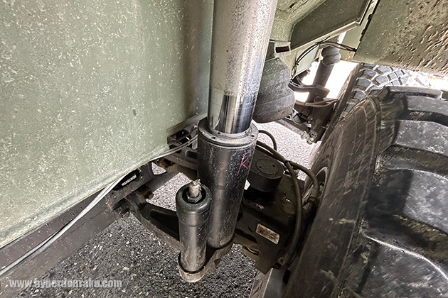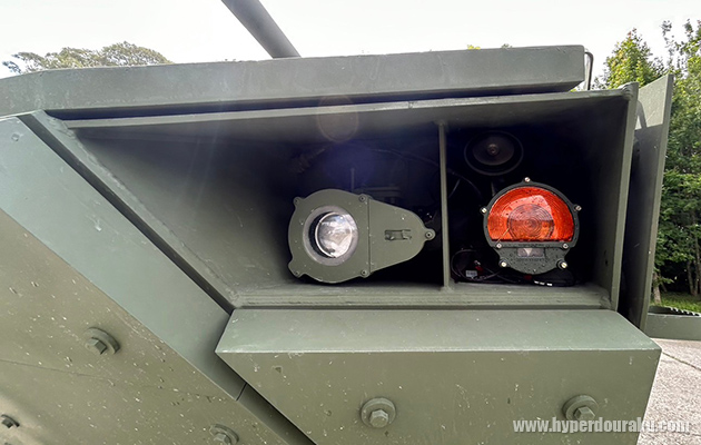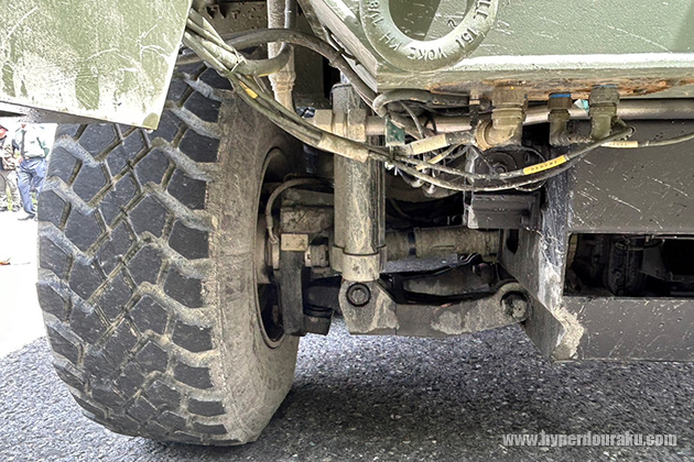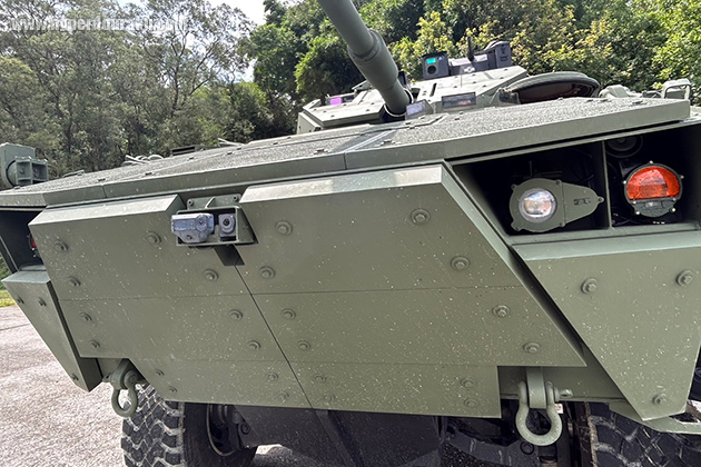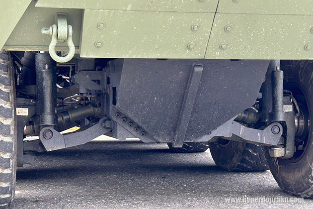 フロント下部。軍側は、国軍で現役の戦車はいずれも履帯式で海岸や砂浜、河川などの地形での運用に向かないと指摘。本新型戦車は履帯式よりも2倍以上の速さで移動でき、砂地や河川、市街地での作戦が可能だとし、現在の作戦ニーズを満たすと強調した。