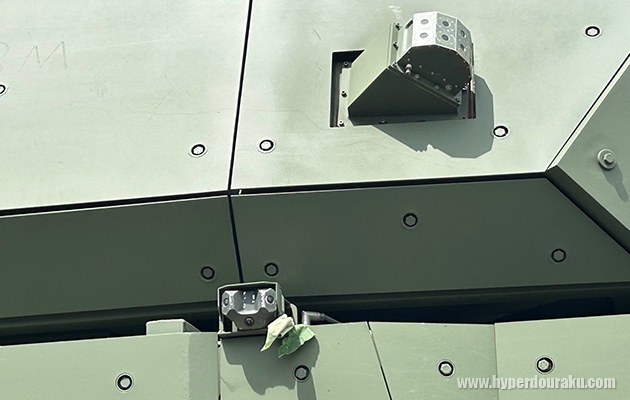 上が砲塔4か所にあるレーザー警報システムのセンサー、下が車体側面のカメラ。