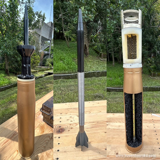 左からXTC112式105mm装弾筒付翼安定徹甲弾(APFSDS)、その弾芯、XTC112式105mm人員殺傷弾。