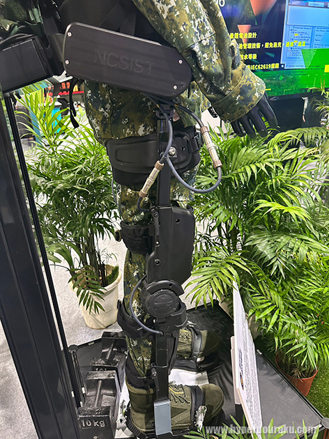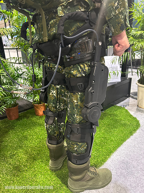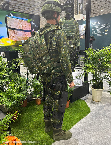 軍用外骨格(エクソスケルトン)。近年、世界中の軍隊で利用されはじめている新しい技術で、作業時のパワーアシストを行うシステム。軍隊だと歩兵の歩行強化、運搬重量増などに貢献する。