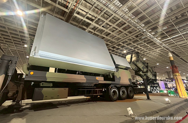 強弓は高度70kmでの迎撃を担い、下層のパトリオットや天弓III型など他のミサイルシステムと組み合わせ、さまざまな目標に対応する多層防空を形成する。今回の展示は、強弓ミサイル、発射架、射撃管制レーダーを含む。ミサイルは垂直発射方式だが、会場スペースの制限により発射架は傾斜配置となった。発射架には4発の弾箱を搭載。弾箱は円形設計で、発射時の空気抵抗を減らす目的があるという。