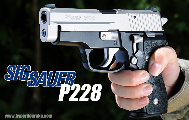 この写真はグアム ワールドガン実弾射撃場所有のSIG P228スライドシルバーの実銃。実際に射撃したが、コンパクトでありながら実に撃ちやすい銃であることが納得できる。