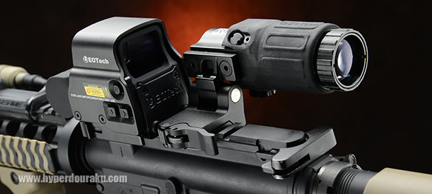 タンデムでドットサイトとMagnifireを搭載するスタイルは米軍のM4カービンでもよく見かける。