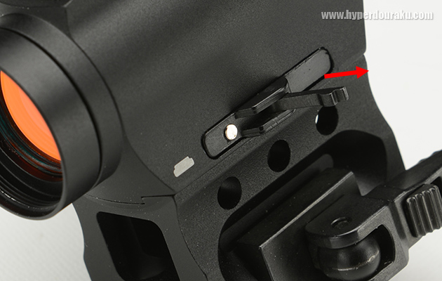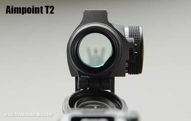参考までに実物Aimpoint T2のレンズ。DD製マウントの高さはドットがフロントサイトの高さと同じAbsolute Co-witnessの設定となっている。