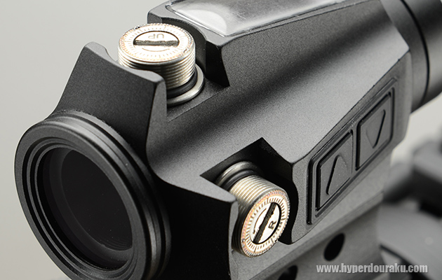 アジャストスクリューキャップを取り外してエレベーション/ウインデージのドット調整が行える。キャップの突起をマイナスドライバー代わりに使える。