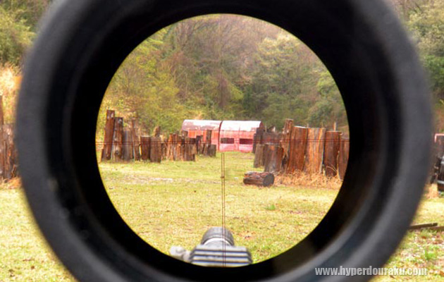 最大の6倍にしたところ。肉眼ではほとんどわからなかった赤いドームの内部の様子まではっきりと見ることができる。誓って言うがこの写真は決してハメコミ合成なんかじゃなく、実際にスコープを銃に装着した状態で屋外フィールドに持ち出して、銃を机の上に置いて銃口部分を三脚で持ち上げて高さの微調整をして(スコープの左下に写ってる黒い棒状のものは、その三脚の一部だ)、カメラを手持ちでスコープの後ろに持って行ってシャッターを切って撮影したものだ。