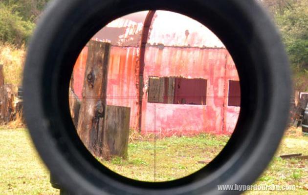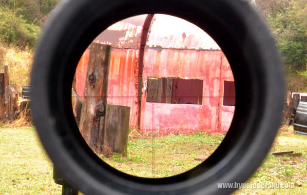 倍率1倍。適切なアイリリーフの位置に眼を置いて銃を構えると、まるでスコープがレンズもなにも入っていない素通しになったかのような奇妙な感覚を覚える。通常、こういった低倍率スコープで最小倍率にすると周辺が歪んだりするものだが、全くそんな感じはしない。これなら「ドットサイト替り」にも使えるんじゃないだろうか。
