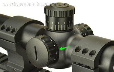 これは「ディオプター」といって、スコープを覗いた時に特別に目を凝らしたりしなくてもレティクルが自然にクッキリと見えるように調節するためのものだ。自分の視力に合わせて調節したら、基本的にはもう触らなくて良い場所である。