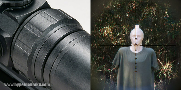 接眼レンズ周囲には「ジオプター(=視度調整)リング」がある。これを回す事で、使用者自身の眼でレティクルが最もハッキリ見えるポイントを設定できる。