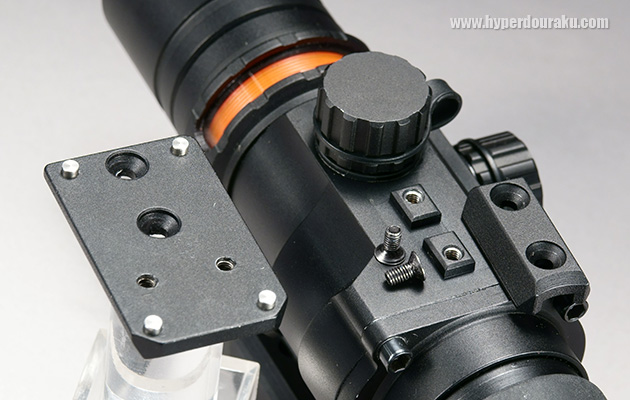 SURE HIT 432 FPSは40mmという短いアイリリーフの関係から銃のかなり後ろに搭載することになるため、ピカティニーレールのスロットに噛み合うラグは前方のみにある。