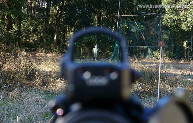 タンデム搭載したSURE HIT MRSで30m先のマンターゲットを狙ったイメージ。専用設計なので、432 FPSのエレベーション・ダイヤルが視野に被ったりしない絶妙なセッティング。