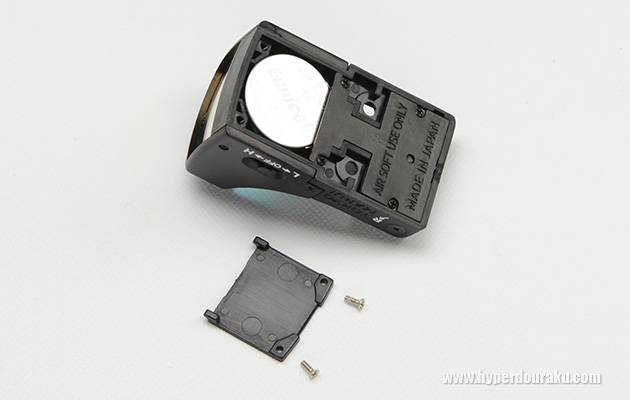 本体底部の蓋を付属の精密+ドライバーで開けると電池を交換できる。電池はCR2032を1個使用する。
