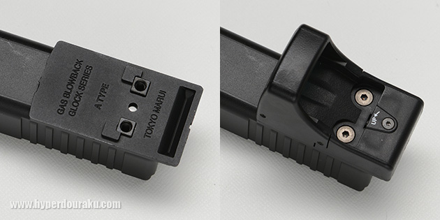 グロックのスライド裏にあるリアサイト固定ネジを外し、ベース取り付け用のダイキャストパーツに変更する。ネジはマウントベース付属のものを使用する。