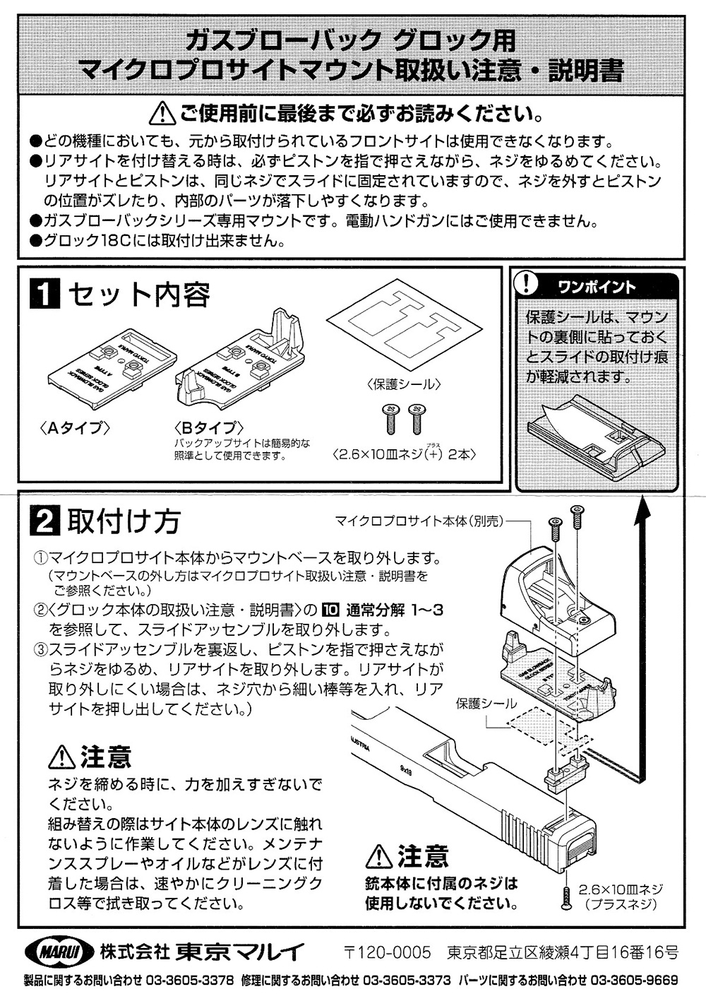 ネジ取り付け部分は亜鉛ダイキャスト製の別パーツとなっていて、一旦取り外して付属の保護シールを樹脂製のマウントベースに貼る。これで銃本体への傷付防止になるそうだ。