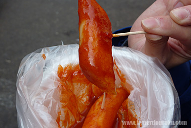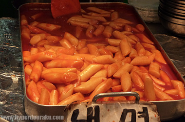 さて、ソウル名物「トッポギ」を買って食べてみる。トッポギとは細長い餅を辛味噌で和えたもの。