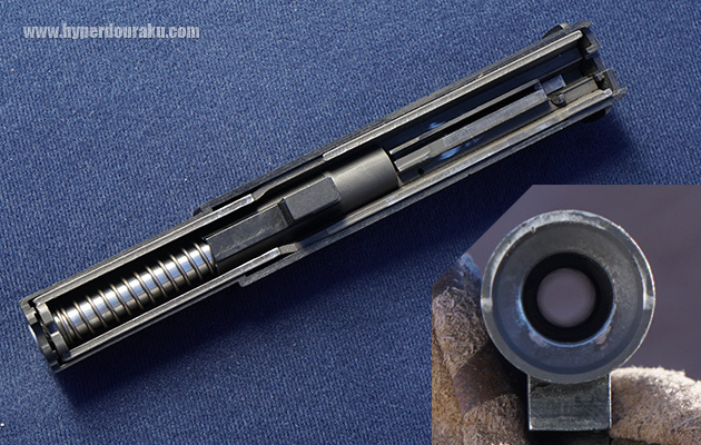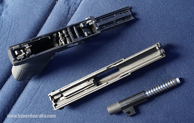ガスブロと全く同じ手順でテイクダウン。スライドの内側には金属製のシャーシというかスライド本体がある。