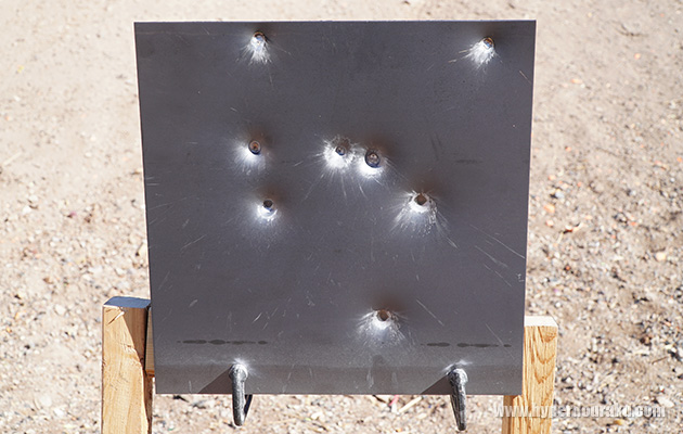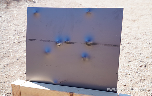 昨年同様に3mm厚のスチール板に拳銃で撃ち込んでみる。