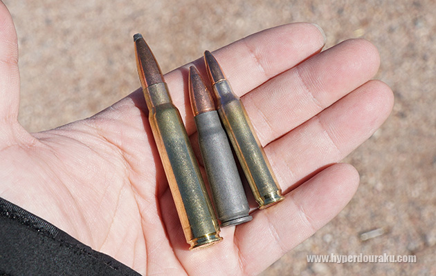 ライフル弾の比較。左から7.92x57mmモーゼル、7.62mm×39、5.56mm×45。