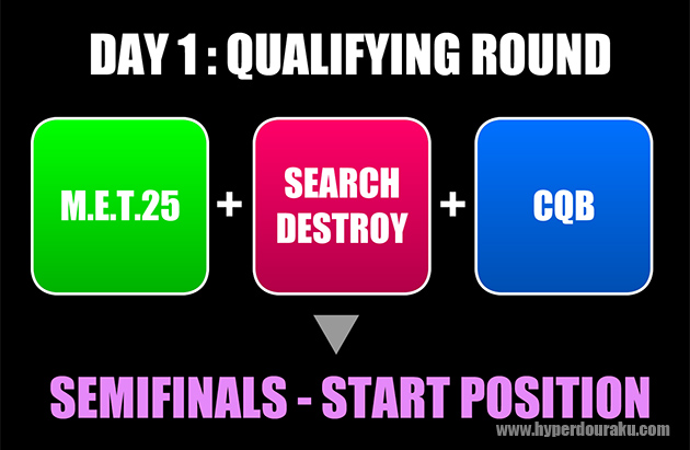 日本の金本・大見ペアはCQBステージで最終エリアの進入不可ラインを踏んでしまいDQ。ポイントが取れず準決勝で1番目スタートとなった。一方、鍋島・斎木ペアは予選2位で通過。