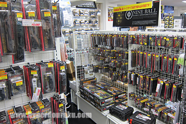 店内の壁面には国内や海外製のエアガンがびっしり!! この数は凄い。