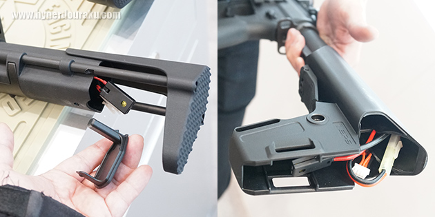 タンカーストックもEPSもリア配線のバッテリー内蔵式。どちらもリコイルユニットと両立している。