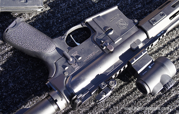 おなじくSpringfield ArmoryのAR15、SAINT VICTOR。M-LOCKハンドガードレイルやストレートトリガーを装備。軽量化のためハンドガードのトップにはピカティニーレールがない。