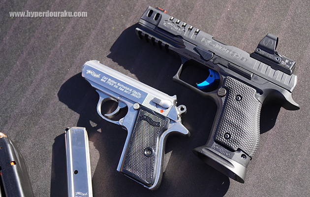 ワルサーの新作はQ5 MATCH SF。SFの名が示すように従来のポリマーフレームのQ5 MATCHからスチールフレームに変更された。重量があるので構えた際に安定感がある。対照的にPPK/s .380ACPも試射。エッジの効いたフレームにストレートブローバックのガツンとくるリコイルが堪らない。