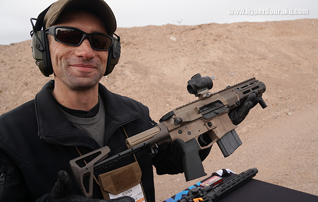 Arsenal FirearmsのAF2011A1 Duellerも撃つことができた。.45ACPのダブルバレル1911で、ワントリガーで同時に.45口径をぶっ放す。グリップもダブルサイズでリコイルもダブル! 何から何まで二倍の迫力でどこに弾が飛んでいっているかわからないほどだった。完全にネタガンである。