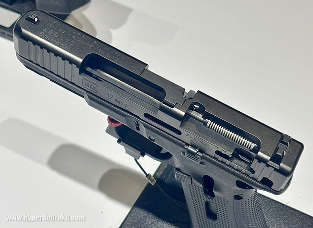 G17 GEN5のカッタウェイモデルも展示されていた。スライドを引いてストライカーや各種インターナルセフティがどのように作動し機能しているのか?を視認することも可能。GEN5から採用されているライフリングがクッキリ刻まれた新型バレルも確認できる。