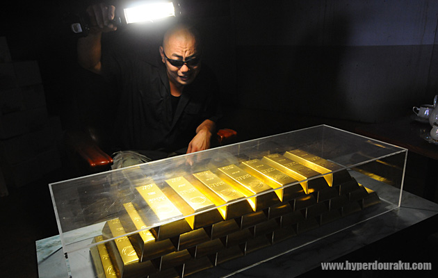山積みされた金の延べ棒!! オーナーのキングジョー氏が金塊を眺めながらクックックと薄ら笑みを浮かべる。