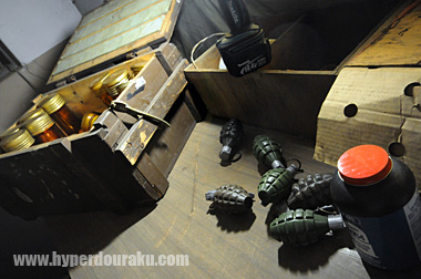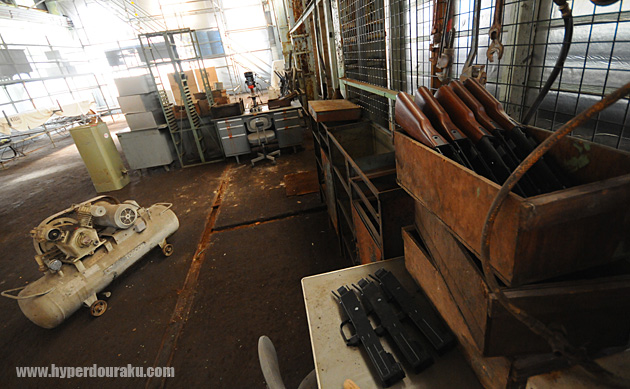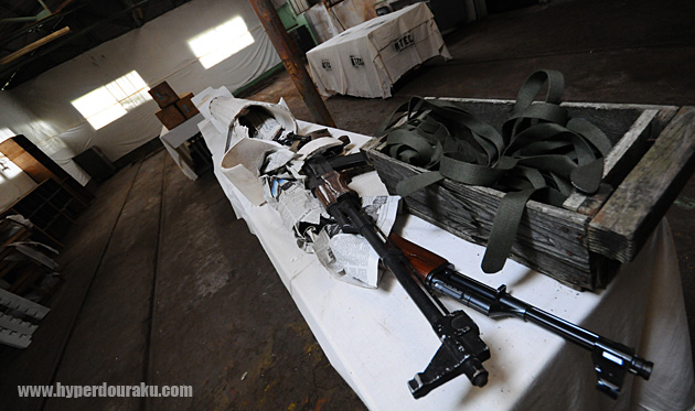 Aフィールド奥はAKのパーツが箱積みされ、いかにも銃器製造現場風の演出。