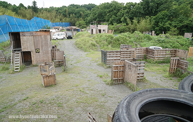砦1Fにはドラム缶の上にドミネーション戦用の缶が置いてあった。この日は朝方雨が降っていたので、ところどころぬかるんでいたが、フィールド全体的に水はけは良さそう。