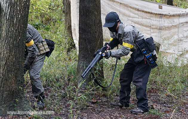 この日は雨ということもあって、電動ガンよりもエアコッキングのショットガンを使うプレーヤーがとても多かった。マルイやCYMAのM3系、マルゼン CA870といったメーカーのショットガンが人気!!
