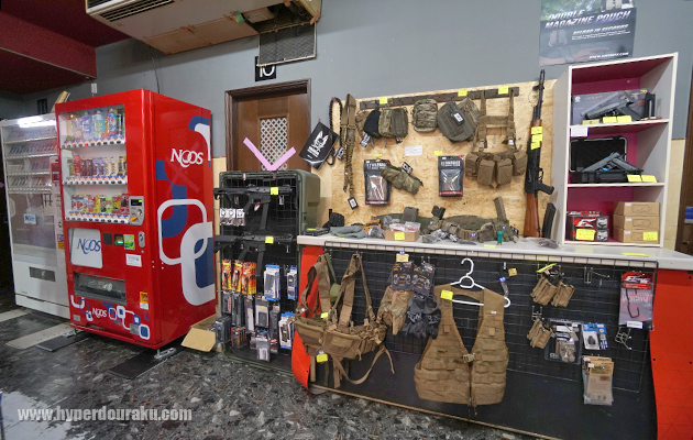 受付横には物販スペースも。弾やガスなどの消耗品のほか、エアガンや光学機器などの販売もあり、充実している。
