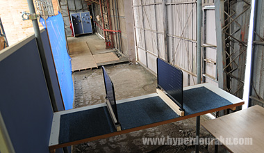 セフティゾーンからこの屋根付きインドアの広めの倉庫内に出る。この右奥にフラッグブザーが設置されている。