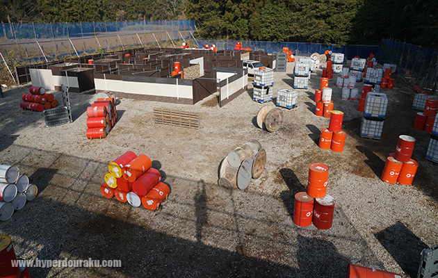フィールドは1万坪と広く、最大プレー人数は40vs40くらいまでだと思うが、それ以下の人数でも十分楽しめる。起伏が適度にあり、進軍が戦略的に展開される。また下草が刈ってあって動きやすいがブッシュの濃い部分もあり隠れる場所も豊富。とくにセフティ側の斜面はスナイパーが活躍できそうなポイント多し。