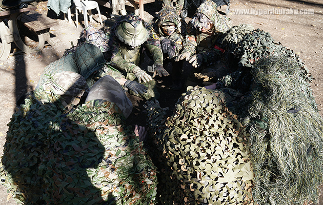 休憩時間はみんなで集まって暖を取る。冬のサバゲーはギリーに限る。得体の知れない塊だなぁ。