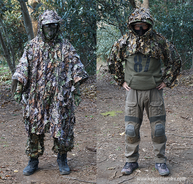 ポンチョタイプやハーフジャケット(ギリーフード)と呼ばれる腕と頭部、胸部のみを擬装するコンパクトタイプもある。プレートキャリアやチェストリグ、腰回りのベルトポーチにアクセスしやすいのが特徴だ。