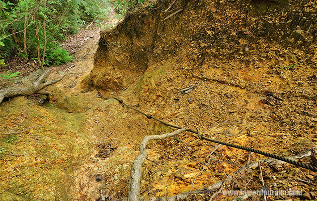けもの道のような所を進んでいると、時折、急な斜面にはロープが打ち込まれており、それを使いながら登ることも下ることもできる。