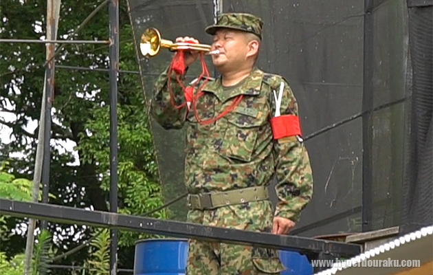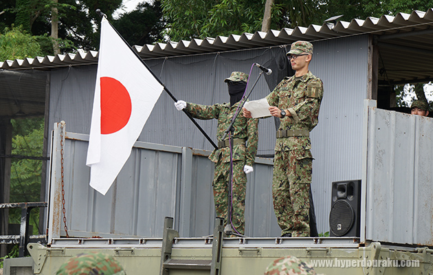 朝礼は陸自、海自、空自と部隊ごとに整列して行う。本イベントは自衛隊装備サバゲーJSOLの派生で発足し今回で2回目の開催となる。