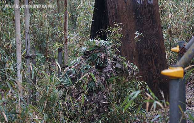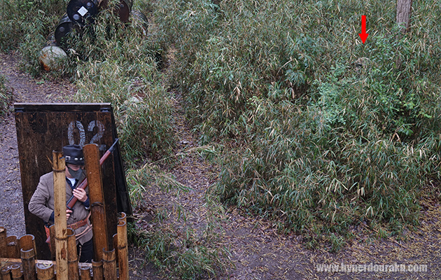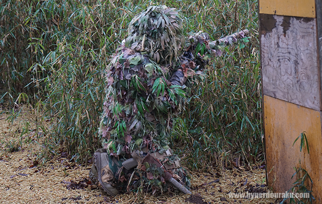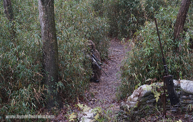 同じようなアングルでギリーを着込んだプレイヤー。フィールドの植生に合わせた笹のギリー。完全に溶け込んでいる。