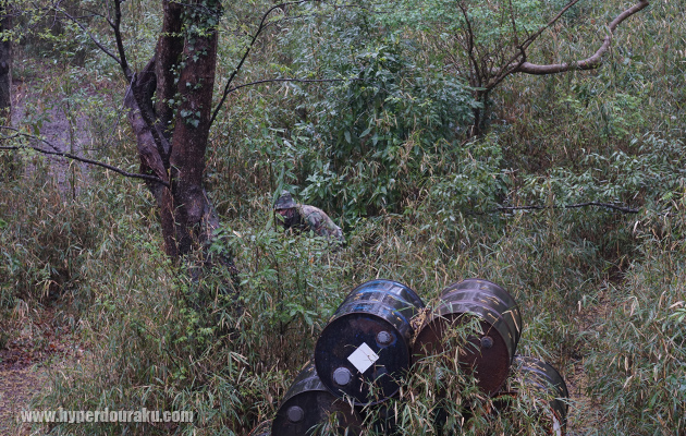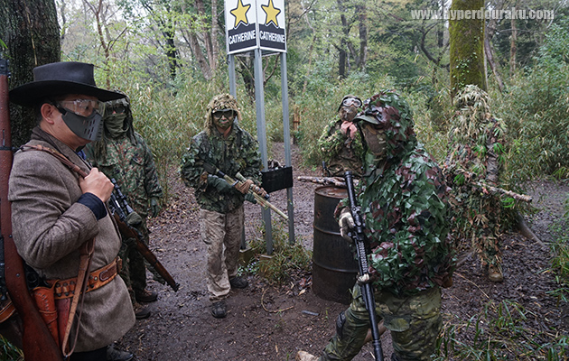 ブッシュに潜むギリー、バリケから動けなくなる西部劇ごっこ主宰のカッタケさん。