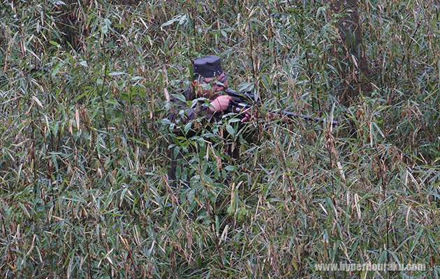 手や顔など、肌が露出しているとブッシュの中で目立つことが分かる。また真っ黒な銃や帽子も目立つ要素だ。