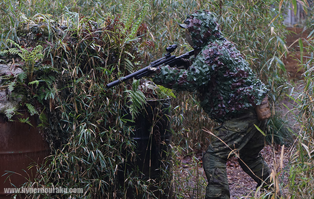 0.98Jの一律パワー制限下、連射できないボルトアクションライフルは電動ガンに比べて不利な点も多い。なので普段の定例会でもボルトアクションユーザーのマーカー着用は自由というルールがあったら、もっとギリースナイパーの活躍の場が増えるんじゃないかな。