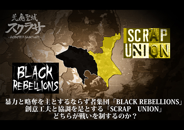 今回のイベントでは、幾度の核攻撃で荒廃しきったセントラルカントー(旧東京)を発祥とし、暴力と略奪を繰り返して勢力を巨大化し続ける「BLACK REBELLIONS」と、核戦争の悲劇から文明の遺産を収集管理しつつ、人と知恵を正しく連帯させ、地に足の付いた「創意工夫と連帯」を是とする「SCRAP UNION」の二大勢力が登場し、戦争を繰り広げたという設定になっているようだ。