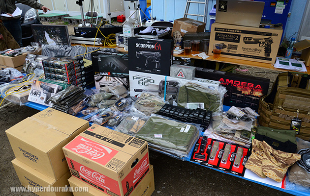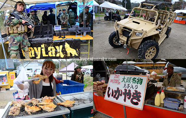 TP Labo、LAND ARMS、SHOEI、サムズミリタリ屋。サムズはドリンクやフランクフルトを販売していた。