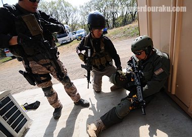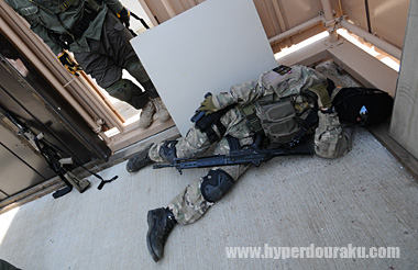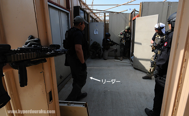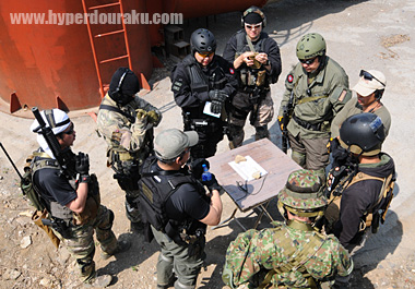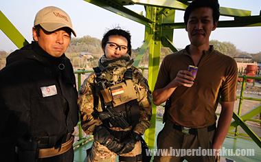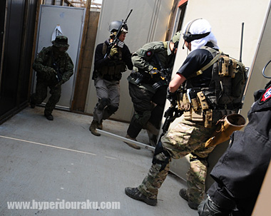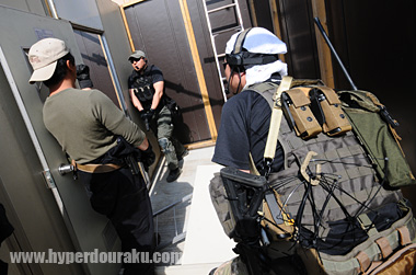 何度か訓練に参加しているメンバーにこんな話も聞けた。CQBの想定訓練で3人で突入したら飛び掛ってきた教官にゴムナイフでポイントマンが羽交い絞めにされた。教官は背が小さく、ポイントマンの背後に見事に隠れている。あっけにとられている二番手に「銃を捨てろっ!!」と威嚇。驚いて二番手が銃を下ろすやいなや教官は二番手に飛び移り、3番手までナイフ1本で全滅させてしまったと言う。訓練前は「んなことできるわけないでしょ~」と思っていたが訓練を受けてみると本当に思えてきた。それほど本職の現場で訓練を積んできた人たちに教えられていると凄さが伝わってくる。